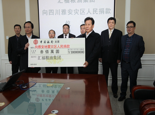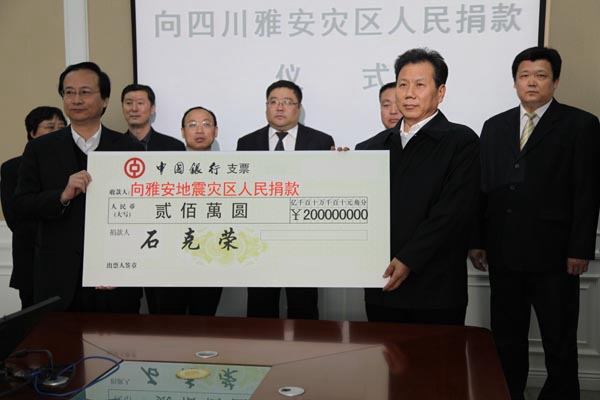 三河汇福粮油集团向雅安地震灾区捐款500万元,其中集团党委书记、董事长、总裁石克荣个人捐款200万元。 石克荣一直热心公益。四川雅安发生地震后,石克荣非常关心地震灾区的情况,并作出决定,他个人向地震灾区捐款200万元。此前的四川汶川地震他捐款450万元。青海玉树地震,他捐款600万元,河北“7·21”洪涝灾害他捐款200万元,他还为三河重特大疾病基金捐款1500万元。
